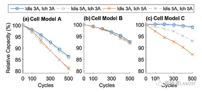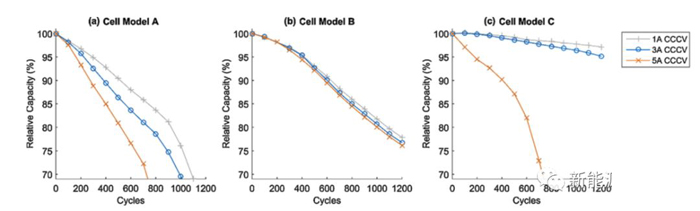 下圖為采用CCCV充電策略時不同的充電電流對于電池循環(huán)壽命的影響,從圖中能夠看到對于電池A,大充電電流會造成電池壽命的顯著下降,例如1A充電時電池的壽命可達1000次,3A充電時電池的壽命就會下降到800次,而充電電流達到5A時電池的壽命則僅為600次左右。但是對于電池B不同的充電電流對于電池的循環(huán)壽命并沒有顯著的影響。對于電池C在1A充電時電池循環(huán)1200次后容量保持率仍然可以達到97%,3A充電時電池循環(huán)1200次后容量保持率為95%,但是在5A充電時電池壽命會發(fā)生快速衰降,壽命不足700次。