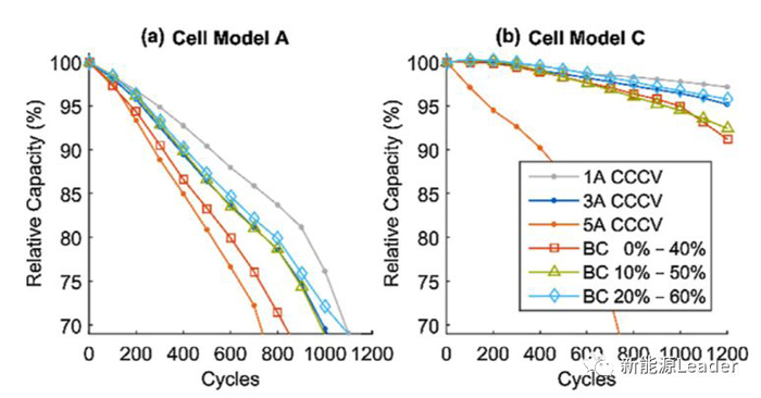 下圖為電池A和C采用BC充電策略的循環(huán)性能,從圖中能夠看到對于電池A,如果從0%開始采用加速充電(5A)則會導致電池的衰降速度顯著增加,與5A電流的CCCV充電策略接近。而如果從10%SoC和20%開始加速充電,則循環(huán)壽命會大大改善,與3A電流的CCCV充電策略接近。而對于電池C,如果開始加速充電的SoC為0%和10%則會導致電池的衰降速度明顯加速,而如果在20%SoC開始加速充電,則對于電池的循環(huán)壽命的影響較小。這也表明在較低的SoC下進行加速充電會導致電池的循環(huán)壽命受到顯著的影響。